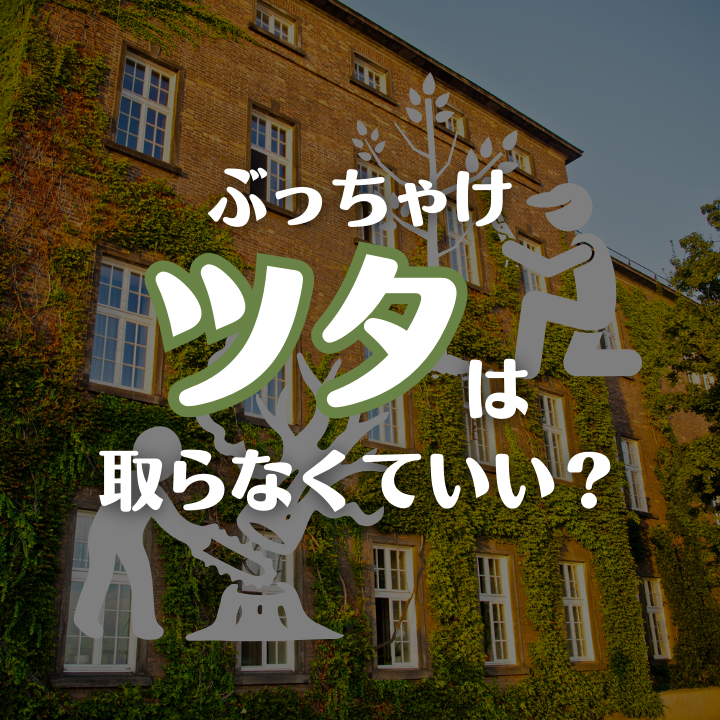 美観の向上: 蔦が壁面を覆い尽くすと、建物の美観が損なわれることがあります。蔦を除去することで建物の外観を清潔で美しい状態に保ち、周囲の景観を向上させることができます。